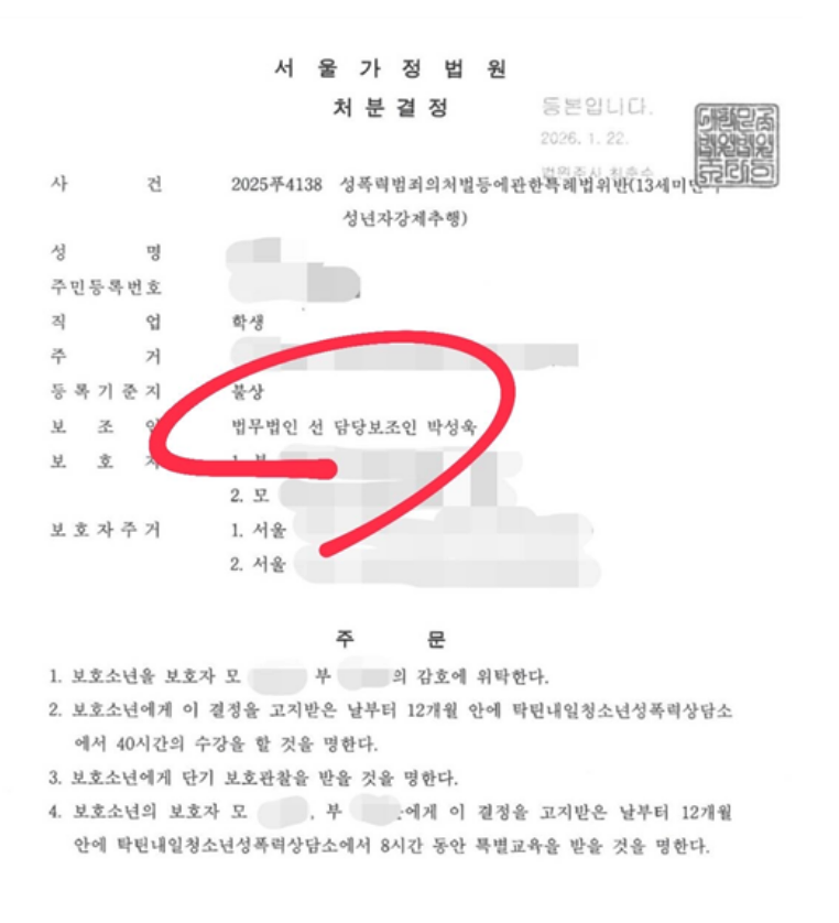 결과: 소년법 보호처분 1호·2호·4호 결정(소년원 송치 없이 부모 보호 하 귀가)