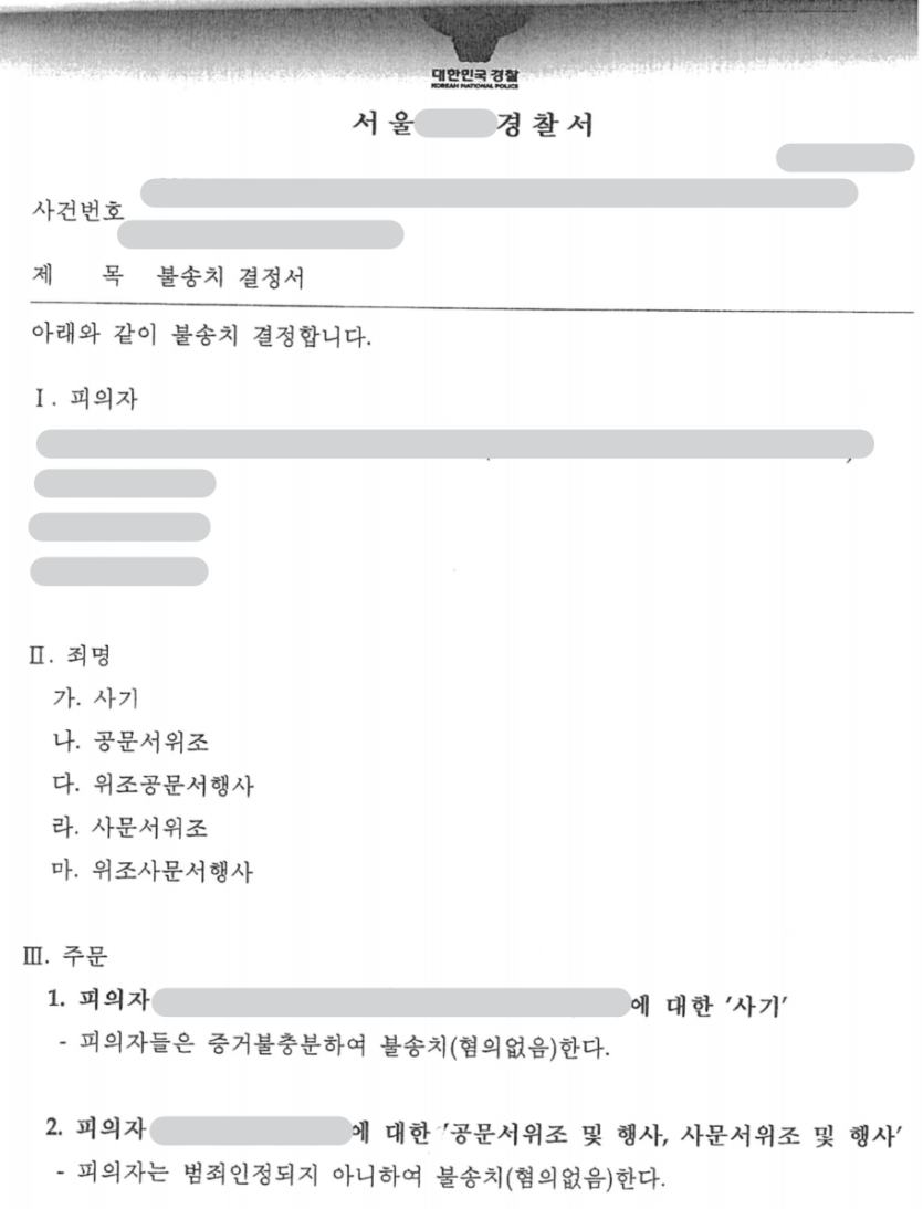 결과: 혐의없음(불송치)