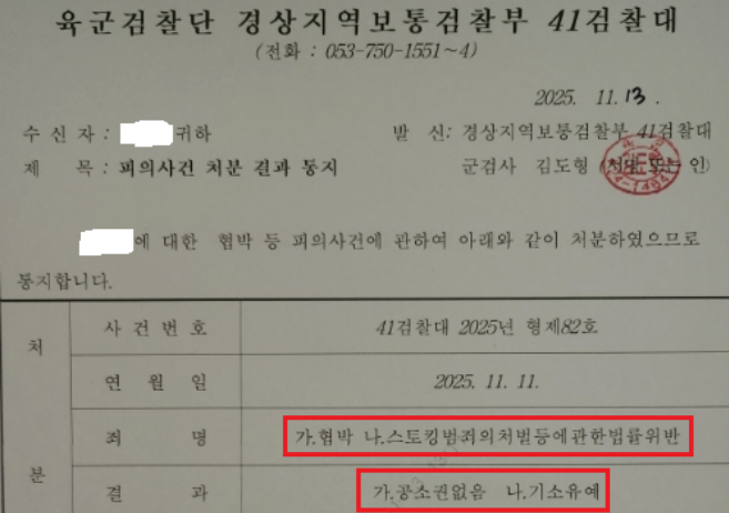 [형사] 스토킹 및 협박 고소 사건 군 수사 단계 기소유예 사례